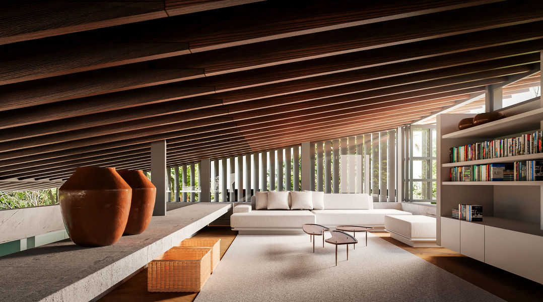 Nos interiores, há uma cuidadosa especificação dos materiais e mobiliário, para que os ambientes adquiram uma expressão atemporal e sofisticada, em harmonia com a arquitetura.